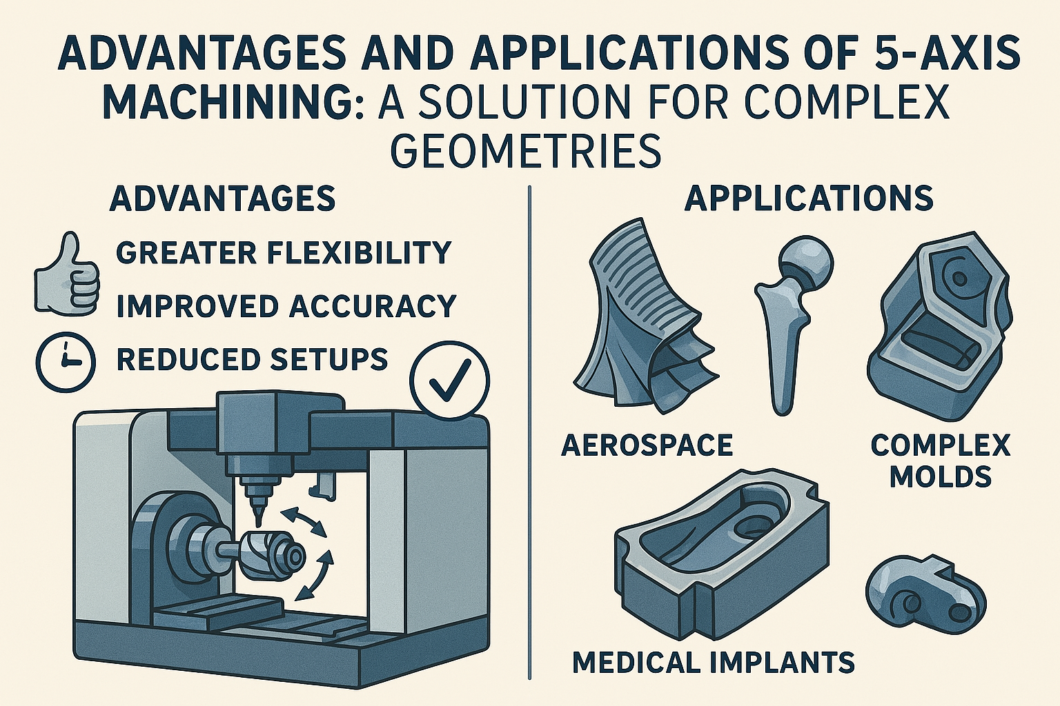 5-axis machines can cut parts with curved or angled surfaces that would be impossible or very difficult on a 3-axis machine.